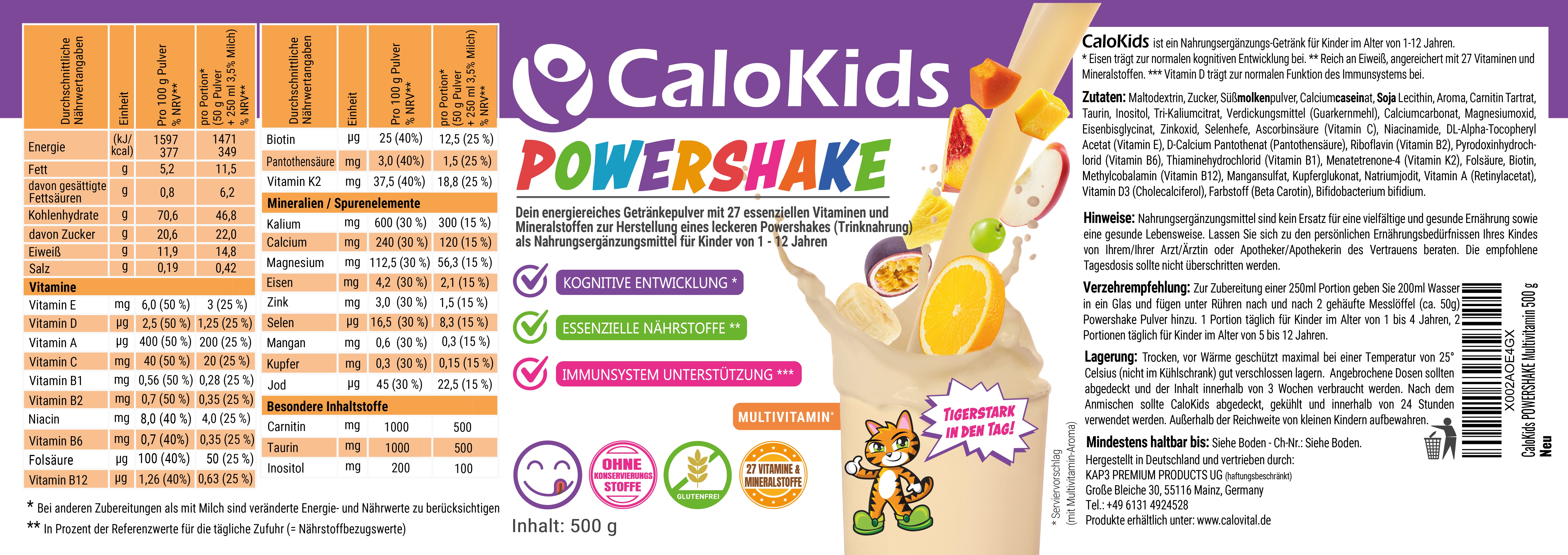 Zutaten CaloKids+ ERDBEERE: Maltodextrin, Calciumcaseinat (14 %) (Emulgator: Lecithine [Sonnenblume]), Vollmilchpulver, Stabilisator: Guarkernmehl; Kaliumcitrat, Aroma, Taurin, L-Carnitin verkapselt (L-Carnitin, Überzugsmittel: Hydroxypropylmethylcellulose), färbendes Lebensmittel: Rote-Bete-Saftpulver; Magnesiumoxid, myo-Inositol, Calciumcarbonat, jodiertes Speisesalz (Salz, Kaliumiodat), Süßungsmittel: Steviolglycoside aus Stevia; L-Ascorbinsäure, DL-alpha-Tocopherylacetat, Eisenpyrophosphat, Menachinon, Nicotinamid, Zinkcitrat, Mangangluconat, Retinylacetat, Calcium-D-pantothenat, Natriumselenit, Kupfergluconat, Cyanocobalamin, Pyridoxinhydrochlorid, Cholecalciferol, D-alpha-Tocopherylacetat, Riboflavin, Thiaminmononitrat, Pteroylmonoglutaminsäure, Bifidobacterium bifidum, D-Biotin.