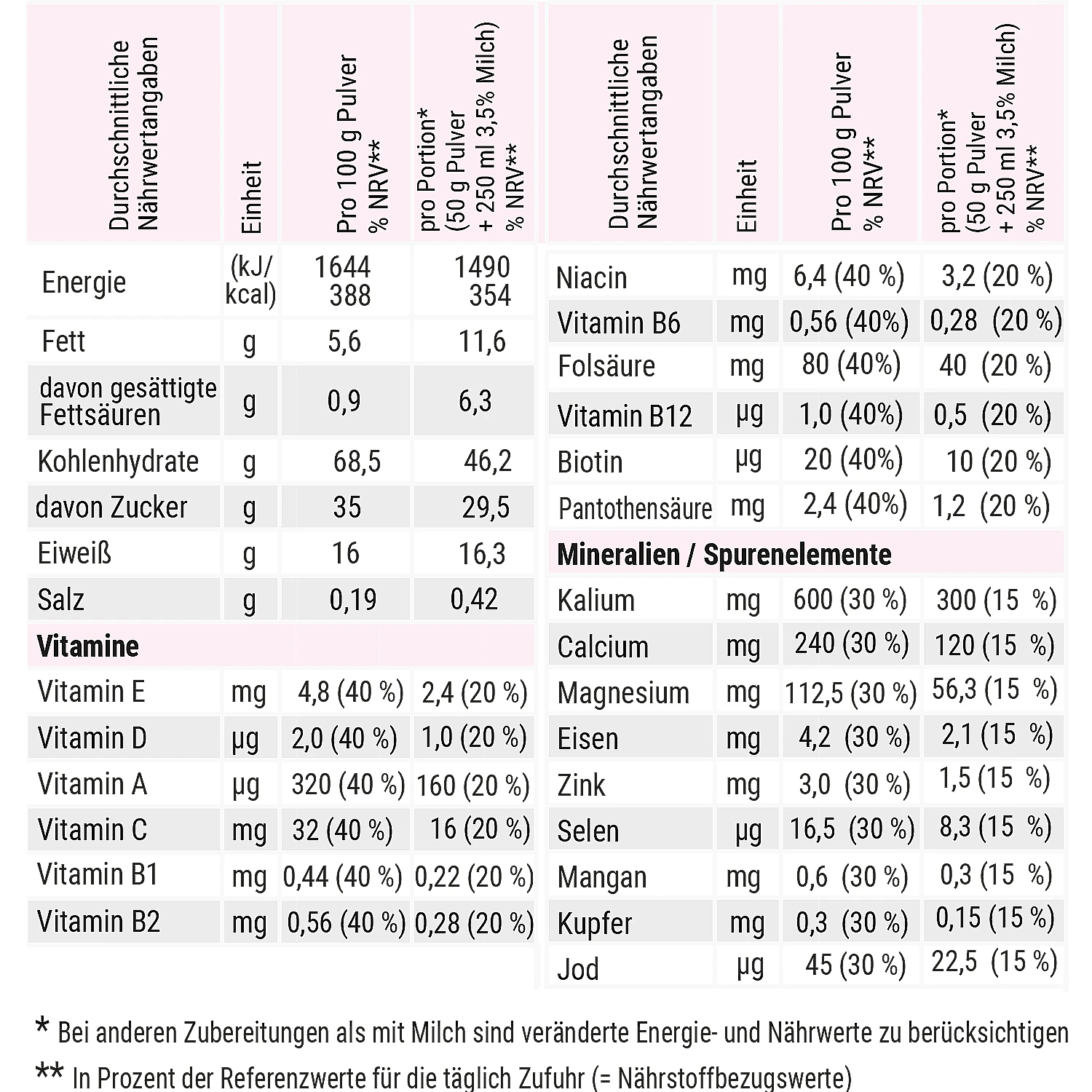 * Bei anderen Zubereitungen als mit Milch sind veränderte Energie- und Nährwerte zu berücksichtigen.