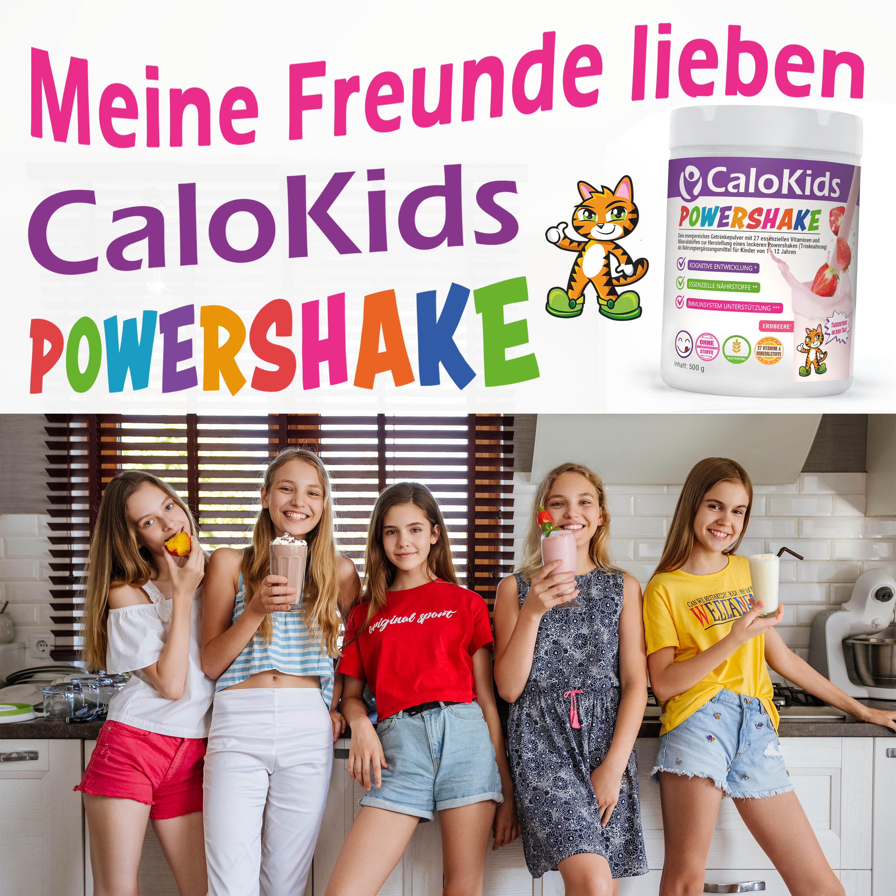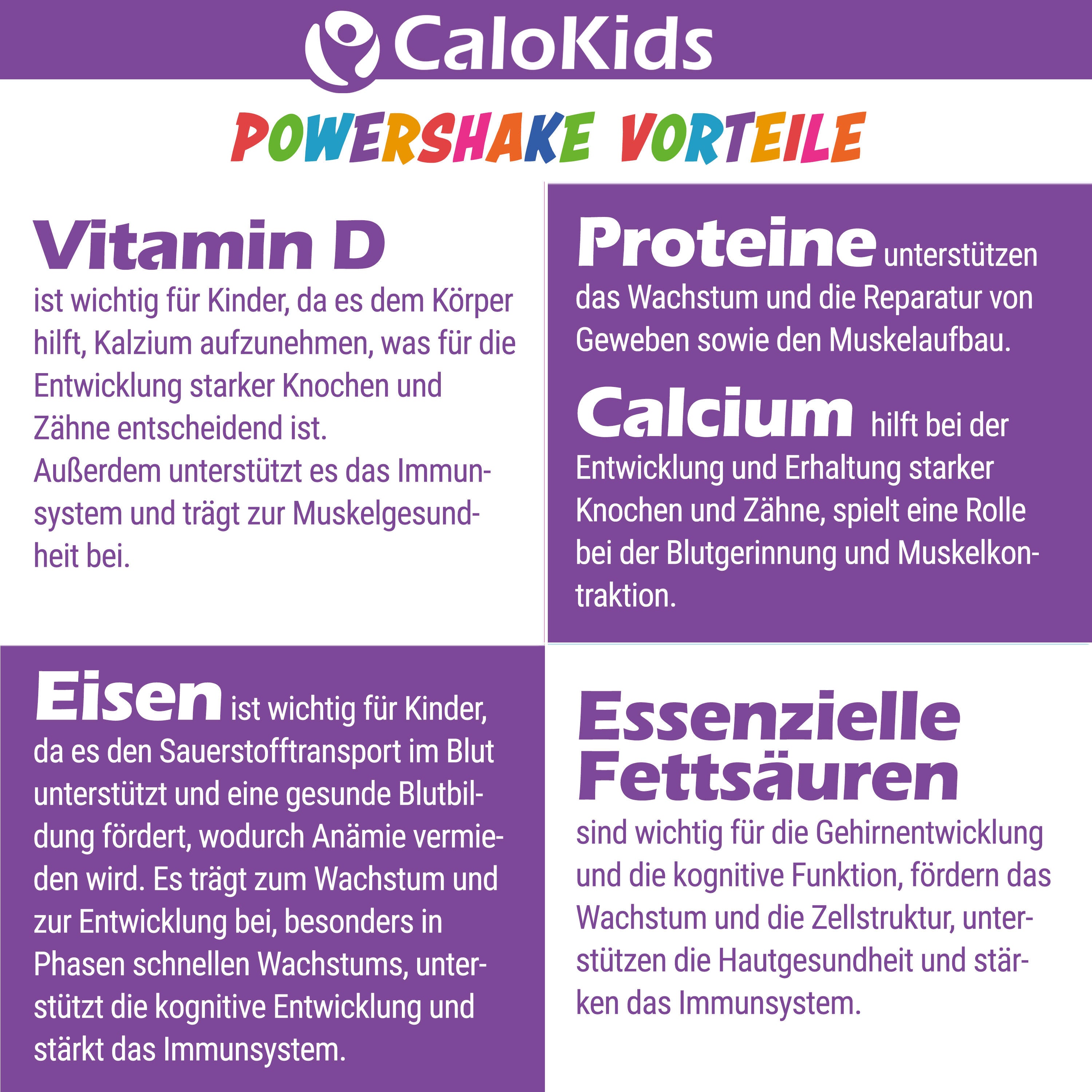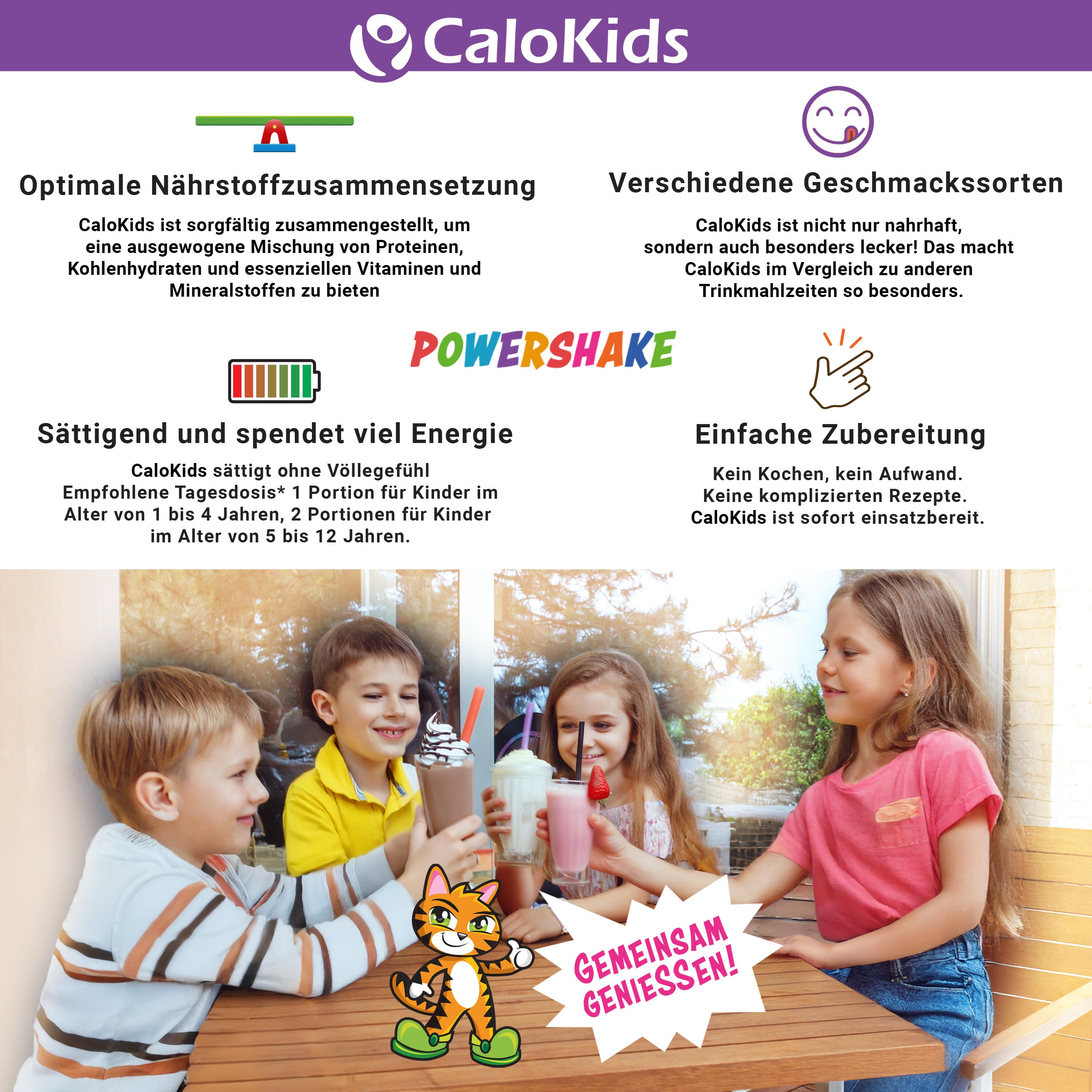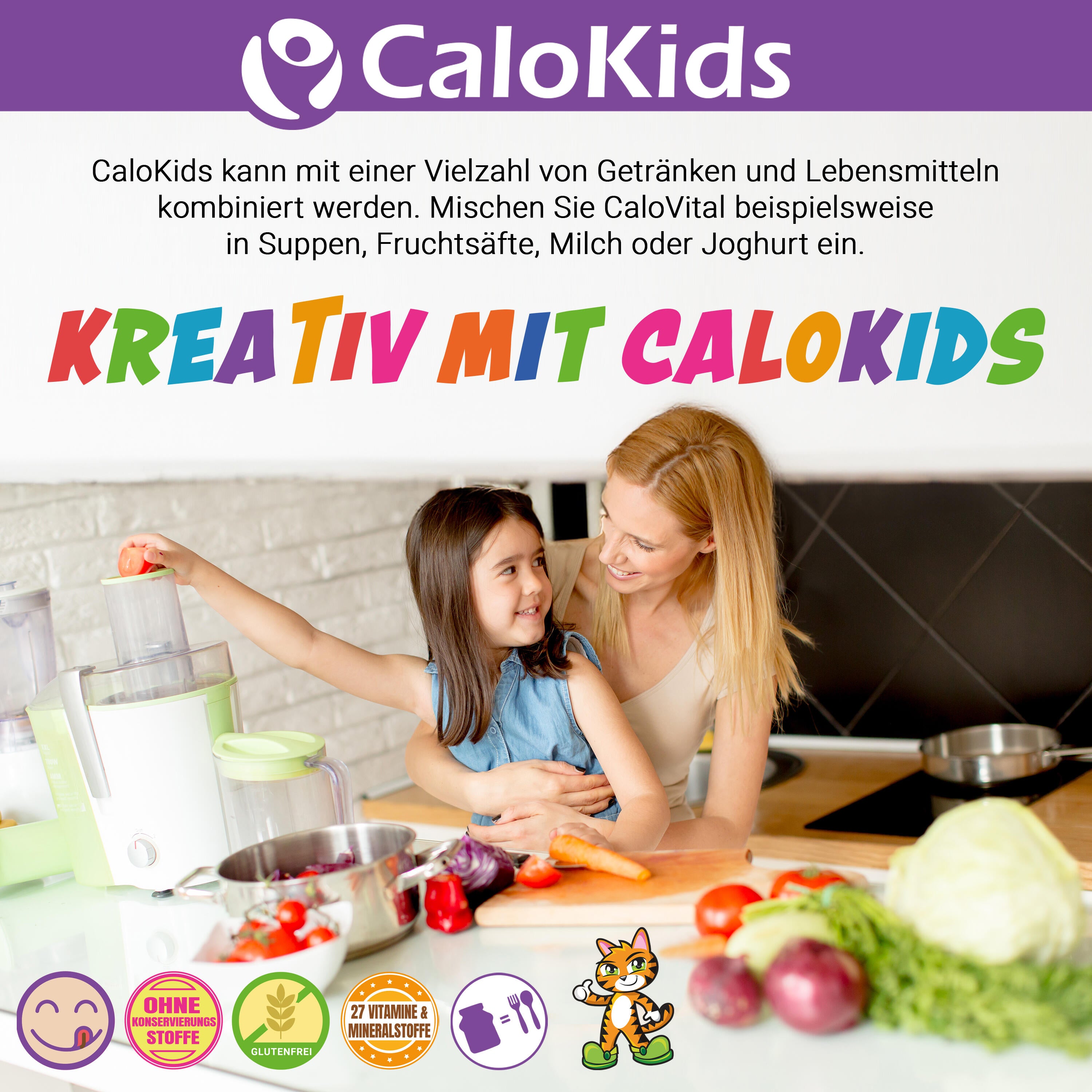 CaloKids ist ein Kinder Multivitamin Getränk und Kinder Nahrungsergänzungsmittel mit 27 essenziellen Vitaminen und Mineralstoffen für Kinder im Alter von 1-12 Jahren. Optimal geeignet als Kinder Vitamine Pulver. Bitte achte auf eine ausgewogene und abwechslungsreiche Ernährung und einen gesunden Lebensstil.