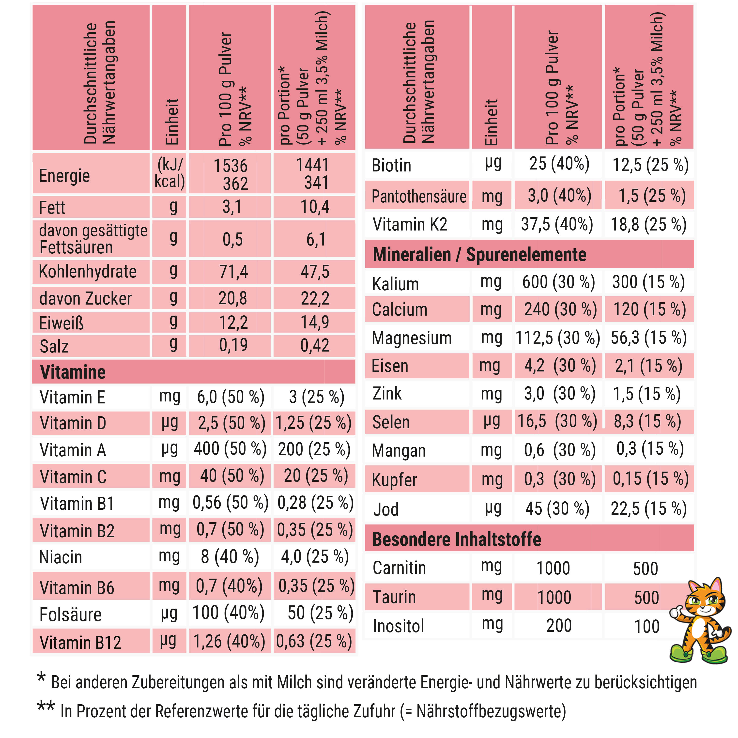 INHALTSTOFFE: Maltodextrin, Zucker, Süßmolkenpulver, Calciumcaseinat, Soja Lecithin, Aroma, färbendes Lebensmittel rote Bete Pulver, Carnitin Tartrat, Taurin, Inositol, Tri-Kaliumcitrat, Verdickungsmittel (Guarkernmehl), Calciumcarbonat, Magnesiumoxid, Eisenpyrophosphat, Zinkoxid, Selenhefe, Ascorbinsäure (Vitamin C), Niacinamide, DL-Alpha-Tocopheryl Acetat (Vitamin E), D-Calcium Pantothenat (Pantothensäure), Riboflavin (Vitamin B2), Pyrodoxinhydrochlorid (Vitamin B6), Thiaminehydrochlorid (Vitamin B1), Menatetrenone-4 (Vitamin K2), Folsäure, Biotin, Methylcobalamin (Vitamin B12), Mangansul- fat, Kupferglukonat, Natriumjodit, Vitamin A (Retinylacetat), Bifidobacterium bifidium.
